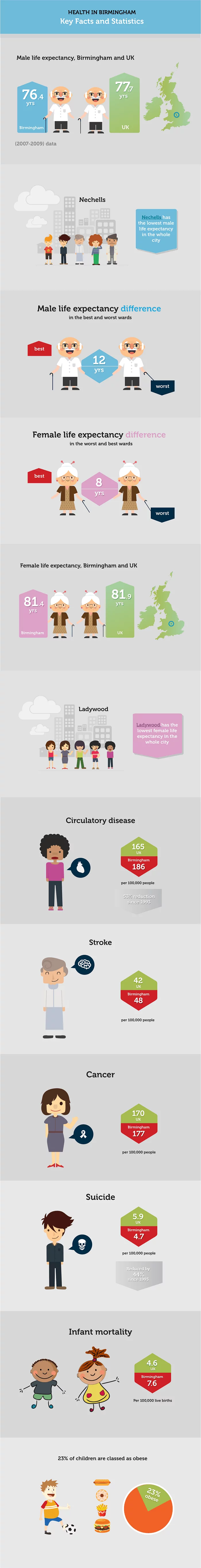 The infographic does contain a number of alarming facts for people living in Birmingham. For instance, people in Birmingham generally do not live as long as people located elsewhere in the UK. This is because the average life expectancy in Birmingham is lower than the UK’s national average.